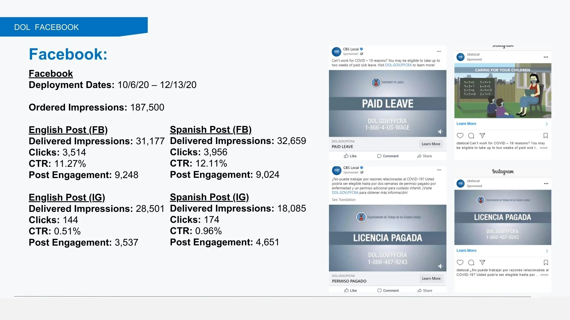 English and Spanish Facebook posts generated click-through rates above 11%, an exceptionally high result for government messaging. Engagement numbers reinforced the same conclusion: when workers encountered this information in a familiar, shareable format, they didn’t just see it—they acted on it.
