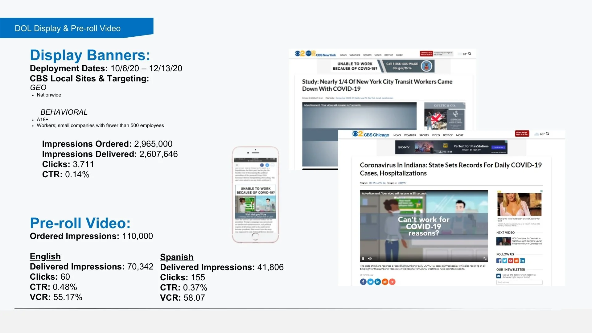 Display banners on CBS local sites delivered broad national reach, serving more than 2.6 million impressions nationwide. With a click-through rate of 0.14%, the banners performed as expected for large-scale programmatic display. Their real value wasn’t driving clicks, but reinforcing awareness and credibility across a wide audience of workers and small businesses.